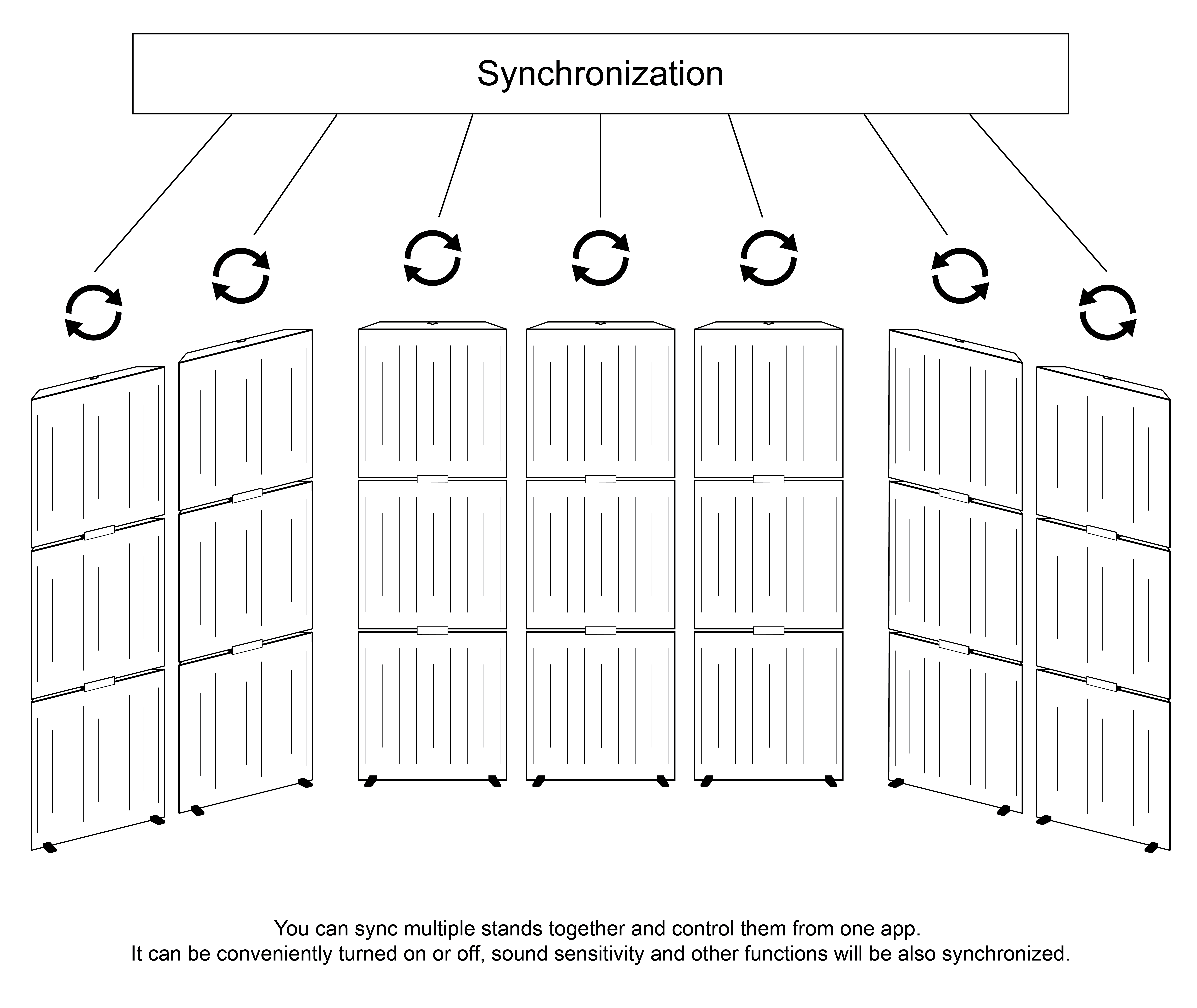 The "Wave" Acoustic Panel Set takes sound absorption to the next level, combining three high-performance sound-absorbing panels with an innovative RGB lighting stand. Designed for professional and personal spaces, this set doesn't just optimize your acoustics—it transforms the ambiance with customizable lighting effects controlled via a remote or app. Illustration of the Synchronization Diagram.